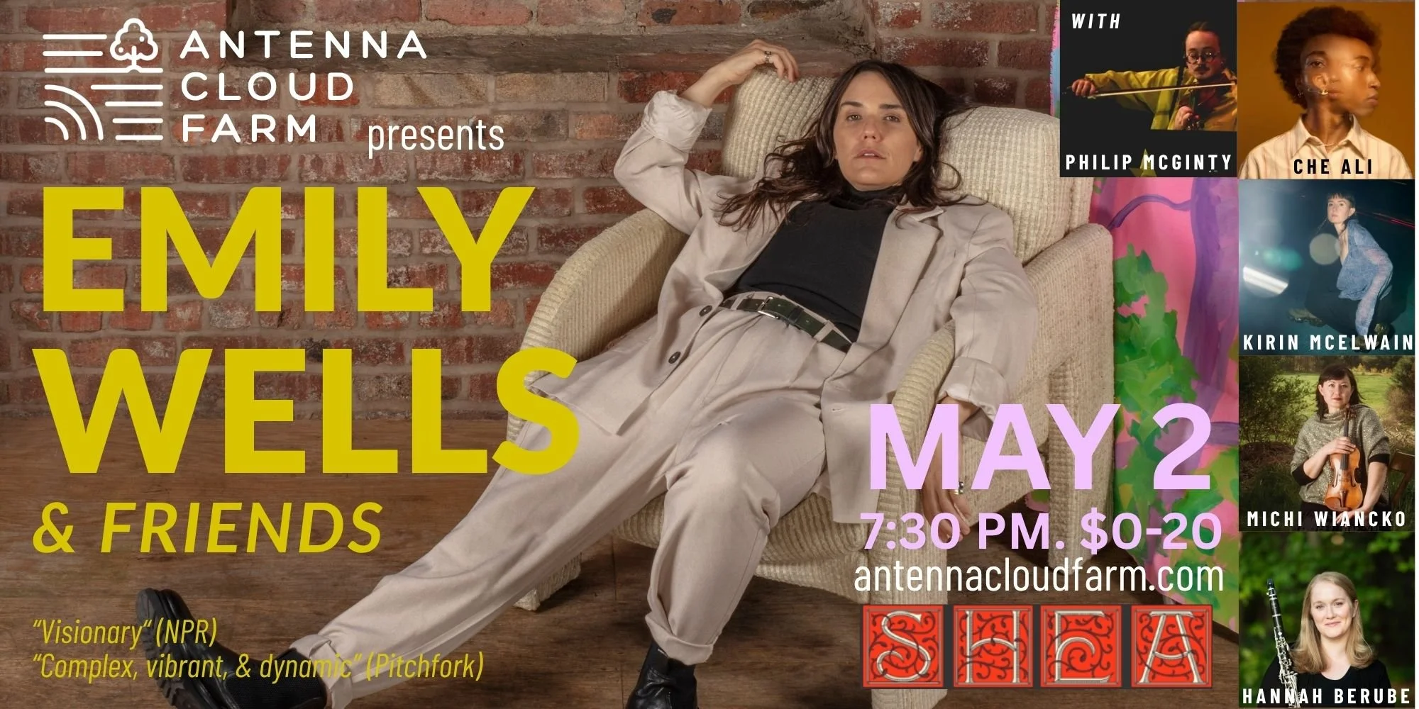 Antenna Cloud Farm presents a special evening of live performance with renowned vocalist, composer, and video artist Emily Wells (vocals, violin, keys, synths, drums), along with special guest artists Hannah Berube (clarinet), Kirin McElwain (cello, composition), Che Ali (violin, composition, Ei alumni), Philip McGinty (viola, composition, Ei alumni), and Michi Wiancko (violin, composition, ACF director).